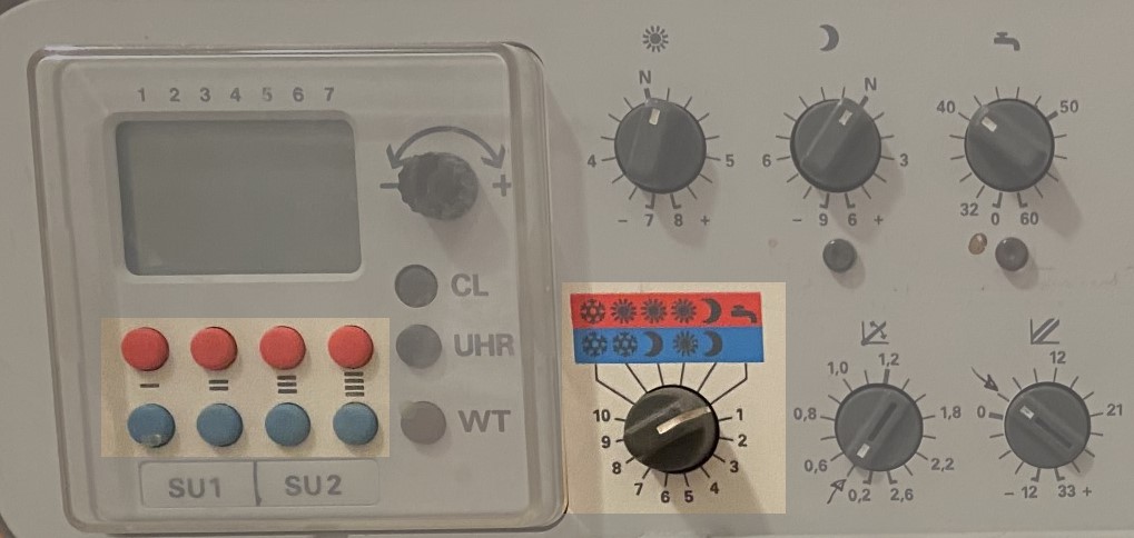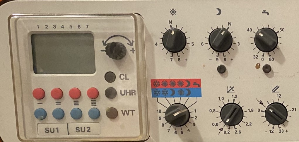 - Der erste Block der Schaltuhr wird nicht verwendet (--:--, weil kein Heizkreis ohne Mischer vorhanden).
