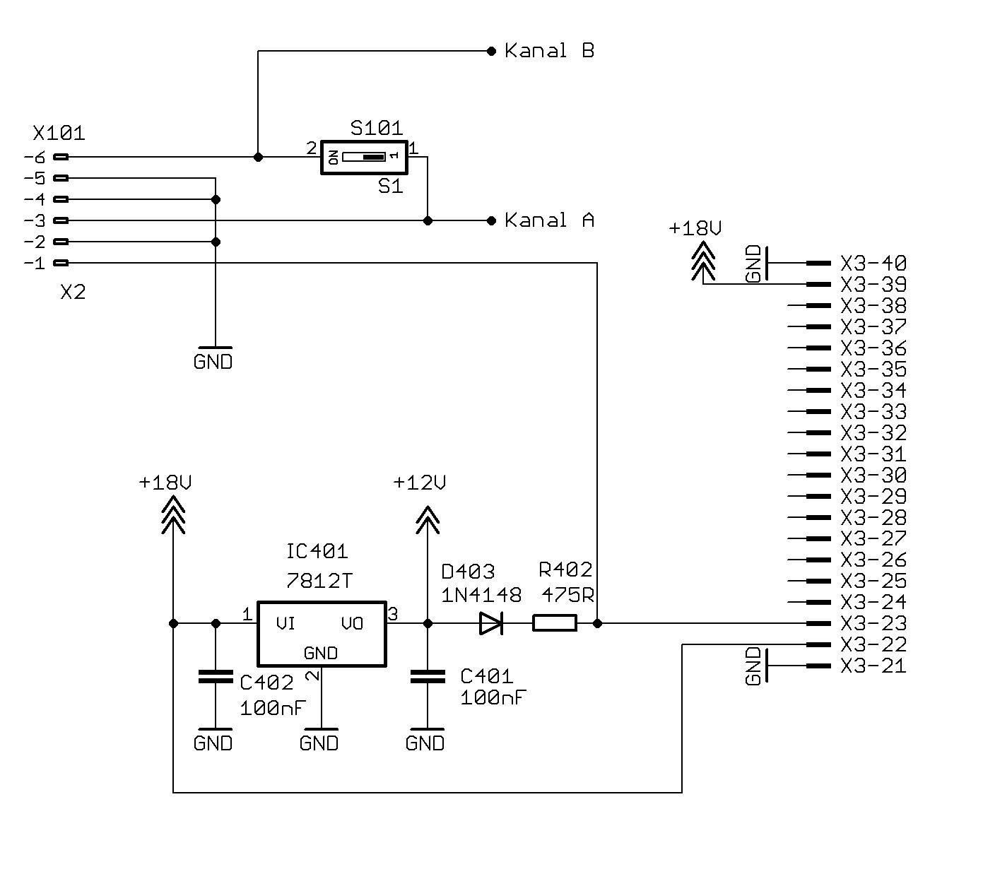 Auf der Stecker-Gegenseite (X101, in der Regelbox, Bild ganz rechts), sitzt die Spannungsversorgung. Sie wird vom