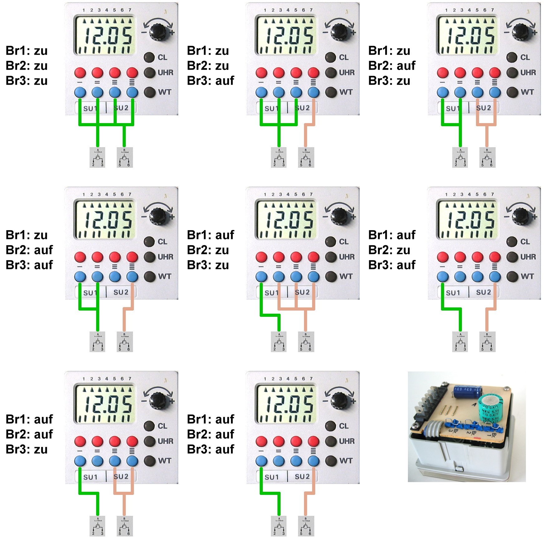 Auf der Rückseite der Schaltuhr befinden sich 3 konfigurierbare Drahtbrücken. Ihre Kodierung definiert die Zuordnung